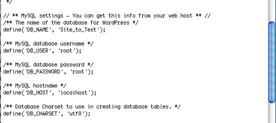 Now, change 'database_name_here' to the folder name you have used (mine is Site_to_Test), then change 'username_here' and 'password_here' to 'root' This is how it should look now: